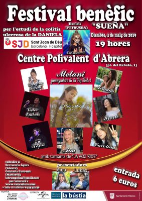 Així, aquest dissabte 4 de maig el Centre Polivalent d’Abrera (plaça del Rebato, 4) a les 19h acollirà les actuacions de Melani (guanyadora de La Voz Kids 4), Georgina Safont, Irene Colmenero, Ariadna Vieyra, CarolinaAna, Victor Embalo i la martorellenca Sofía Muñoz, a més d’altres sorpreses.