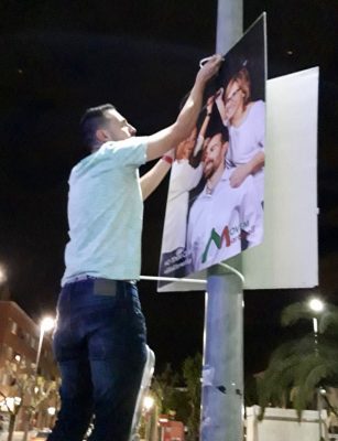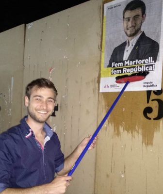 El candidat d’Esquerra Republicana de Catalunya de Martorell, amb l’enganxada de cartells i el lema ‘Fem Martorell, Fem república’.