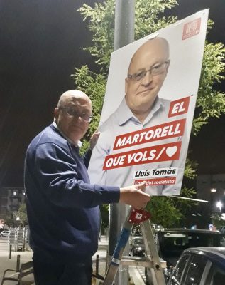 El candidat del Partit dels Socialistes de Catalunya de Martorell, amb l’enganxada de cartells i el lema ‘El Martorell que vols’.