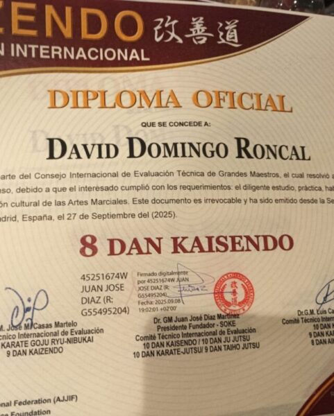 El martorellenc David Domingo Roncal, de 52 anys, monitor de karate i kaisendo del Patronat Municipal d’Esports de Gelida, ha rebut un reconeixement internacional aquest mes de novembre. Durant la gala Hall of Honors de Barcelona, la Federació Internacional de Kaisendo li ha fet entrega del vuitè dan (Hacidan) i de la distinció de Shihan per la seva trajectòria i mestratge excepcional.