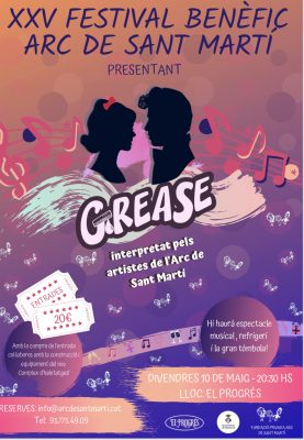 La Fundació Privada Arc de Sant Martí aquest divendres a El Progrés celebra els 25 anys de festivals benèfics a Martorell destinats a millorar la vida a les persones amb altres capacitats. La cita és a les 21h amb una vetllada plena d’actuacions del musical Grease. La recaptació es destinarà al nou complex d’habitatges residencials per a usuaris, a l’avinguda del Camí Fondo. Des de l’octubre passat, usuaris de la fundació, familiars i amics de l’entitat assagen, sota la direcció artística de Beni Martos, passatges del musical Grease.