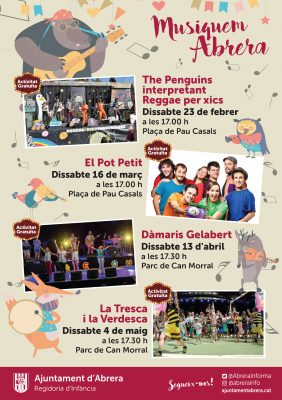 La nova proposta musical per a tota la família ‘Musiquem Abrera’ porta música, ball i ritme amb quatre concerts, un dissabte de cada mes de febrer al maig. El primer és aquest dissabte 23 de febrer, amb The Penguins interpretant Reggae per xics, a les 17h a la plaça Pau Casals.