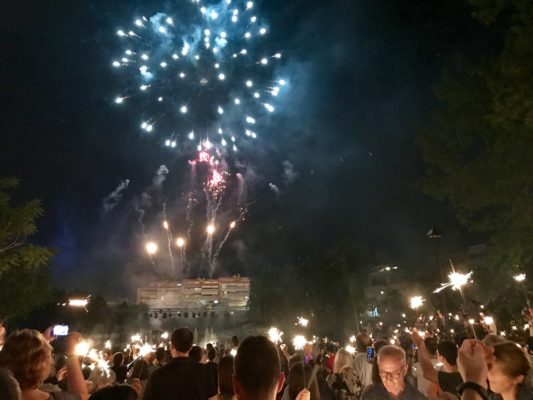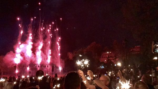 L’espectacle d’artifici, colors i música de poc més de 6 minuts ha sorprès el públic que va veure com els focs sortien del mateix recinte del Llac. Minuts abans, l’Ajuntament va repartir bengales perquè els assistents participessin en l’acte encenent-les quan sonés la cançó ‘Imagine’ de John Lennon. Aquesta activitat és una de les novetats d’enguany.