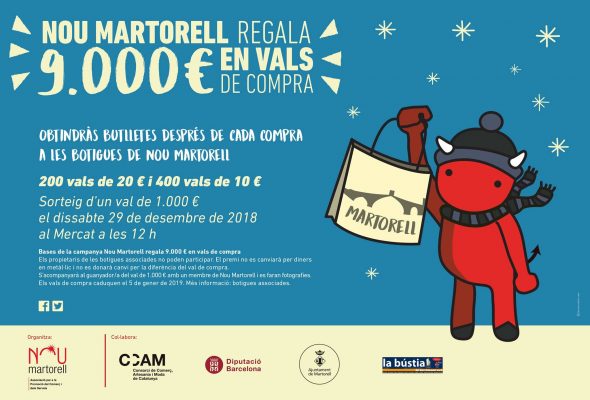 La campanya nadalenca organitzada per l’associació de comerciants Nou Martorell ha començat aquesta setmana i s’allarga fins a l’últim dissabte del mes de desembre. Les botigues participants regalen 600 vals de compra per un import total de 9.000€. Desglossat, s’han posat en circulació 200 premis amb vals de 20€ de descompte i 400 de 10€.