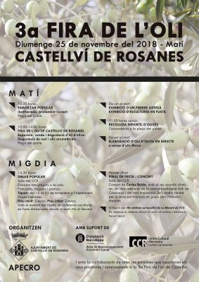 La 3a Fira de l’Oli de Castellví tindrà lloc aquest diumenge 25 de novembre i un any mes, el centre neuràlgic de l’activitat serà la plaça del poble, on de les 10 del matí fins les 14h hi haurà estands, exhibicions i degustacions.