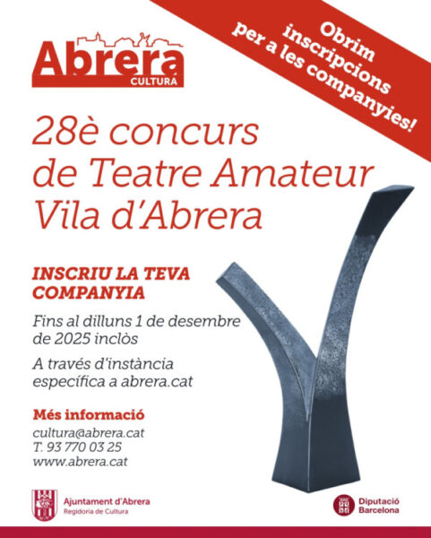 L’Ajuntament d’Abrera organitza un any més el Concurs de Teatre Amateur Vila d’Abrera. Fins aquest dilluns 1 de desembre inclòs, les companyies de teatre amateur que vulguin participar-hi s’han d’inscriure a través d’aquest enllaç.